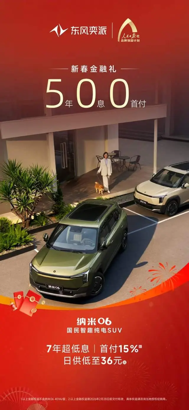“国民智趣纯电SUV”纳米06同样诚意登场,除可享5年0息0首付的新春金融礼,还支持7年超低息、首付15%起、日供低至36元起金融方案。纳米06作为“天元智能”品牌技术的首款量产国民纯电车型,立足“实用、灵活、可靠”的核心价值,率先将超越同级的智能体验带入国民车,凭借可靠的智能辅助驾驶、个性化的智能座舱交互、越级的空间表现以及20余项主动安全配置等产品实力,为用户提供高价值的智趣出行新选择。同时,叠加新春福利权益,进一步降低纳米06入手门槛,让更多消费者轻松体验高品质出行。