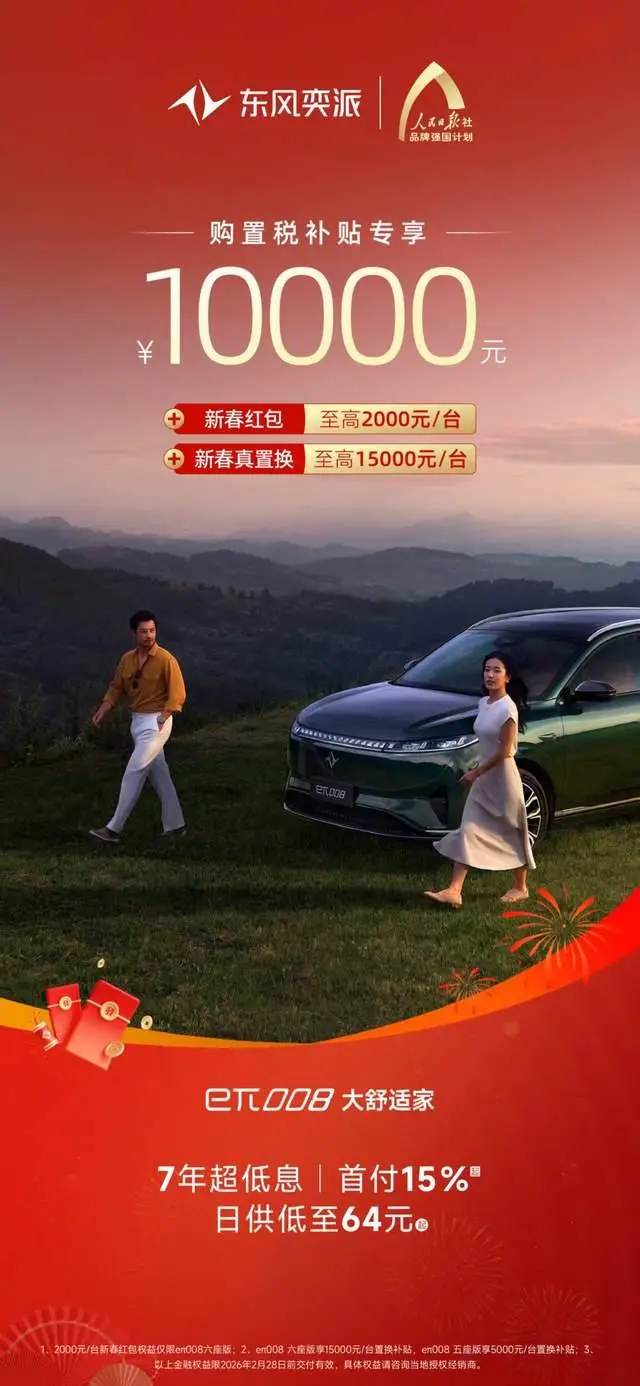 备受家庭用户青睐的“大舒适家”奕派008,以“真满配、真智能、真超值”全能产品力满足用户多元化需求。值新春之际,推出限时10000元专享购置税补贴、至高15000元置换补贴等福利;此外,即日起至2月28日前,凡在东风奕派官方APP/小程序下订奕派008的用户,还可领取2000元“马利”红包,为新的一年增添“马上有利”好彩头!在金融端,还推出7年超低息、首付15%起、日供仅64元起购车政策,让更多家庭轻松升级出行品质。作为家庭SUV的价值标杆,奕派008以更高品质、更具温度的体验,重新定义家庭出行新高度。