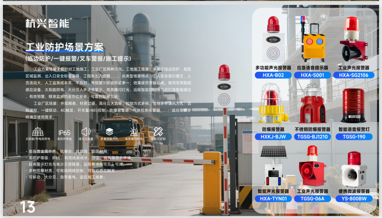 l 代表产品 HXAB02X:多电压兼容、120dB 声光报警、IP54 防护、遥控调音量、USB 换语音,工业环境稳定不掉线。