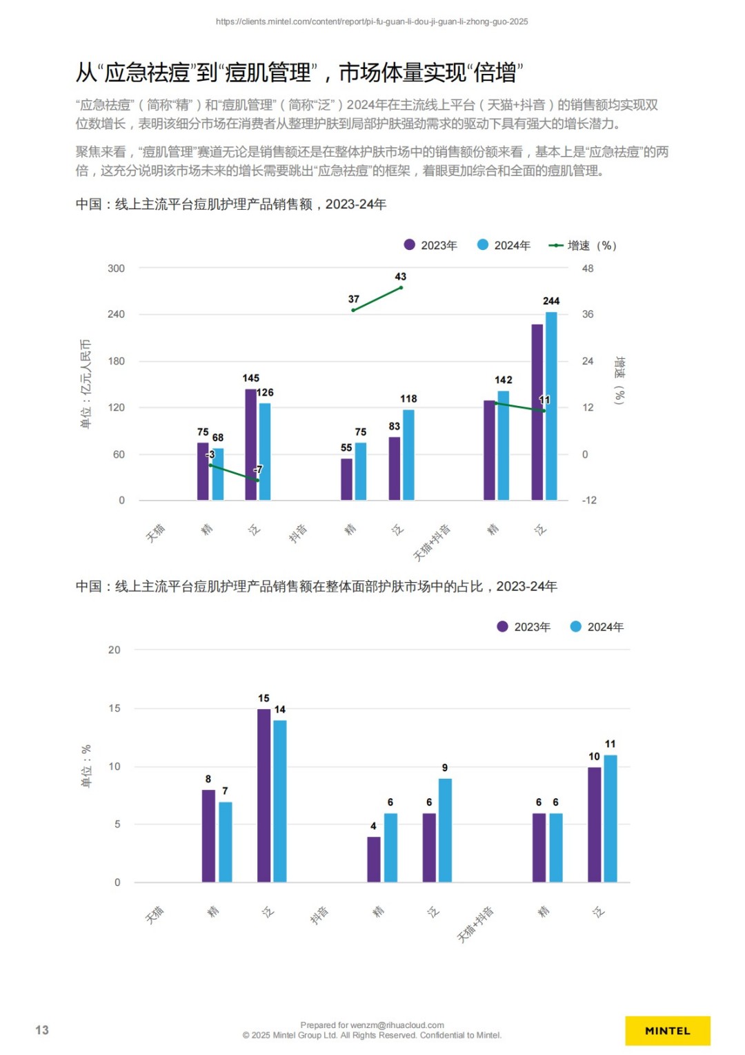 从市场数据来看,2024 年,线上主流平台的 “应急祛痘” 和 “痘肌管理” 相关产品销售额均实现了双位数增长。其中,“痘肌管理” 赛道的销售额及其在整体护肤市场中的份额,基本上是 “应急祛痘” 的两倍。这一数据充分说明,消费者对于痘肌管理的意识正在初步觉醒,市场规模的扩大需要从 “急救祛痘” 向 “痘肌管理” 拓展。