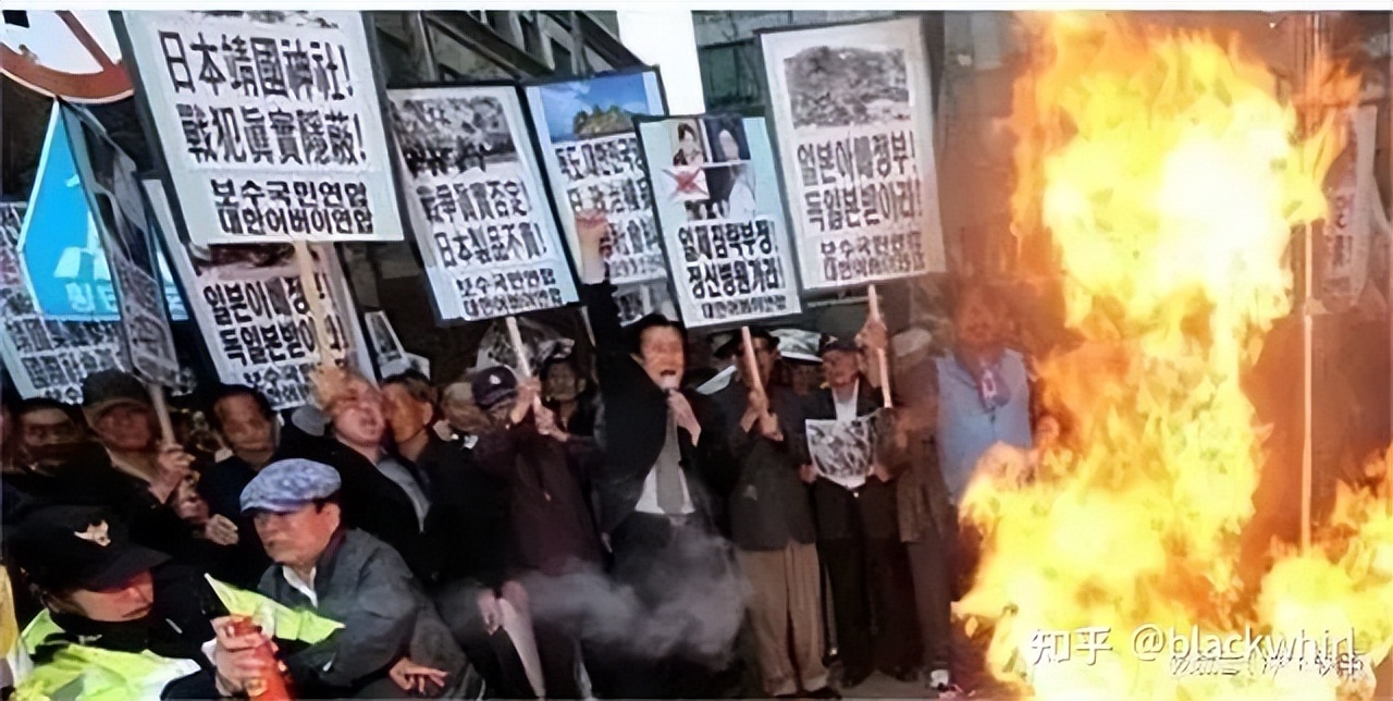 刘强看到没有人相信真相,不得不再做一件引人注目的事情,那就是在日本驻韩国大使馆门口烧日本国旗。