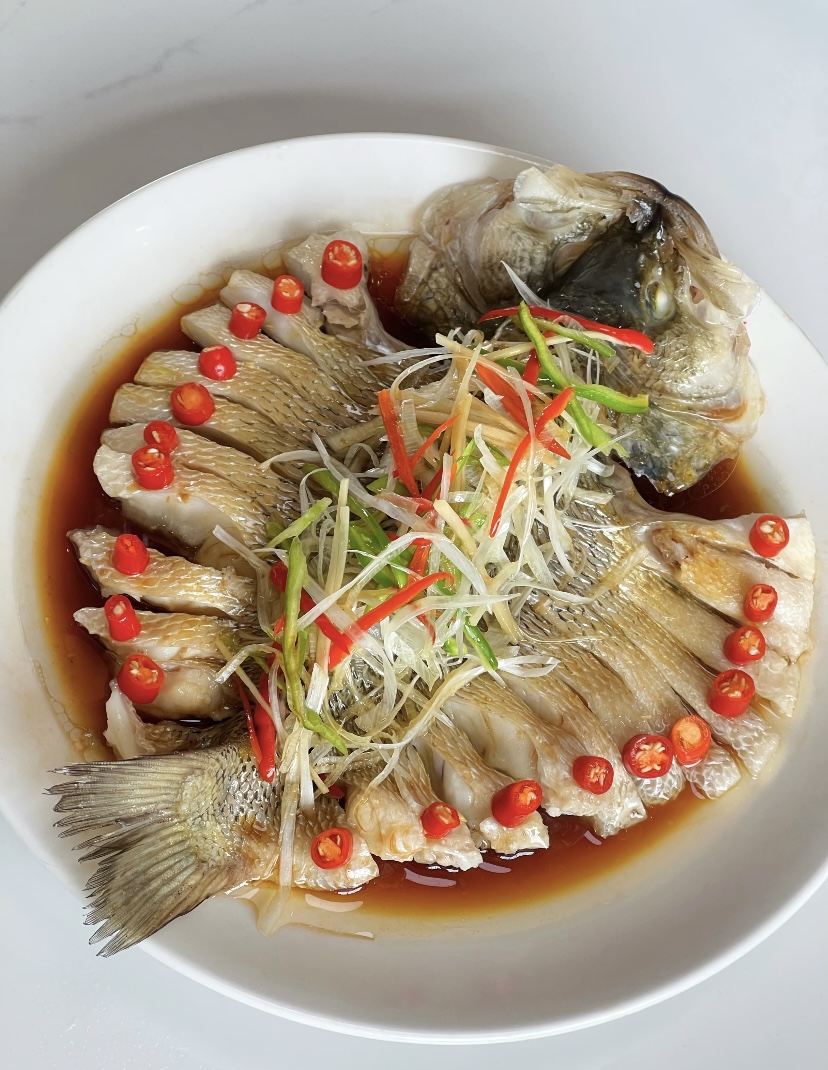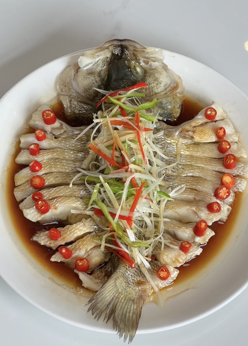 出锅后的处理细节决定风味上限。蒸鱼盘中的水必须倒掉,这是腥味重灾区;换上新切的葱丝、小米辣圈,既提色又增香。淋蒸鱼豉油时要沿着盘边缓慢倒入,让豉油顺着鱼肉缝隙渗入,避免直接冲击鱼肉导致口感变咸。最后淋热油是点睛之笔:油温烧至冒烟(约180℃),从葱丝上浇下,高温瞬间激发出葱香、油香与豉油的酱香,鱼肉表面形成薄薄的油膜锁住汁水,每一口都是鲜嫩爆汁的体验。