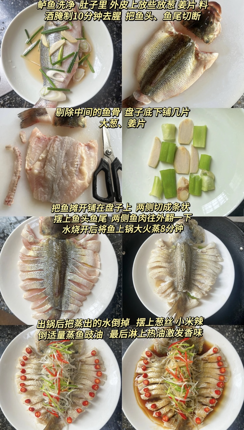 腌制期间可准备蒸鱼配料。图片中展示了盘底铺葱段姜片的细节,这不仅是装饰,更暗藏玄机:垫底的葱姜在蒸制时能持续释放辛香,通过蒸汽渗透鱼肉,同时避免鱼身直接接触盘底导致受热不均。接着是改刀环节,用厨房剪刀剔除中间的鱼骨是个聪明做法——让鱼肉完全摊平,蒸制时热量能均匀包裹每寸鱼肉,尤其鱼腹部的肉较厚,切条状后能与鱼背同步成熟,避免“外熟内生”的尴尬。摆盘时把鱼头鱼尾摆正,鱼肉往外翻折,既保留完整鱼形,又让鱼肉在蒸制时收缩自然,保持紧致弹嫩的口感。