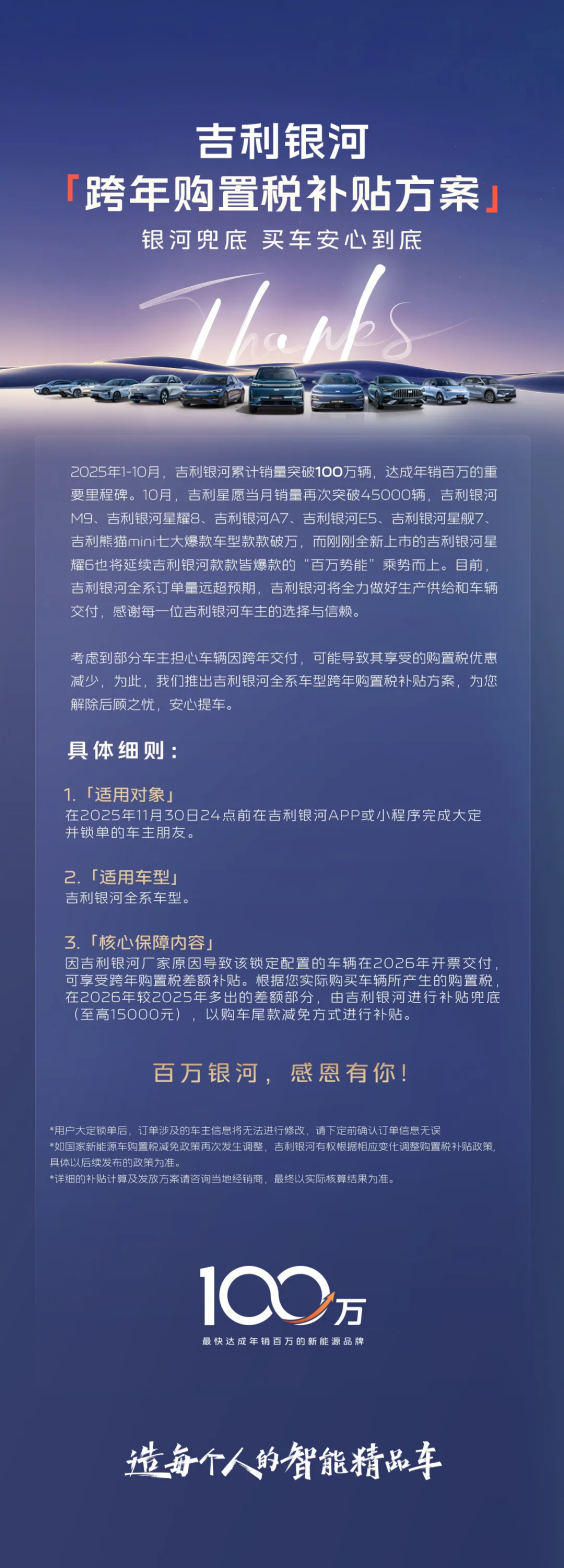 针对计划冬季购车的用户,吉利银河推出了跨年购置税补贴政策:2025 年 11 月 30 日 24 点前完成大定锁单,可享受差额兜底,避免因交付时间错过优惠。对于北方用户而言,这款解决了冬季续航焦虑、兼顾节能与补能效率的混动 SUV,无疑是当下购车的理想选择。