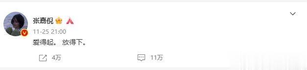 前段时间,张嘉倪老公买超被拍到与一位年轻女生约会,两人在酒店共度好几个小时,男方算是彻底被坐实出轨。紧接着,张嘉倪发微博回应:爱得起放得下,疑似回应与买超婚变。