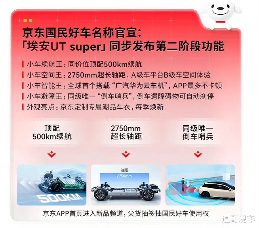 【文/财圈社&道哥说车 麻建宇】10月23日,据京东汽车公众号消息,京东联合广汽集团、宁德时代推出的“国民好车”车型名称正式官宣定名——“埃安UT super”,并同步释放了部分新车信息点。据悉,新车续航500公里,支持换电,诞生A级平台并拥有B级车的空间。