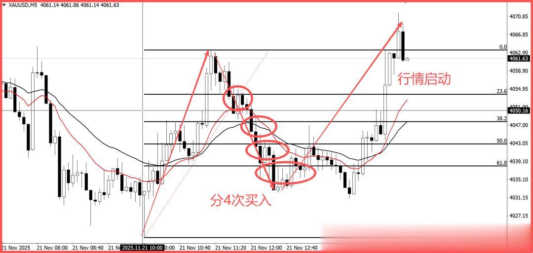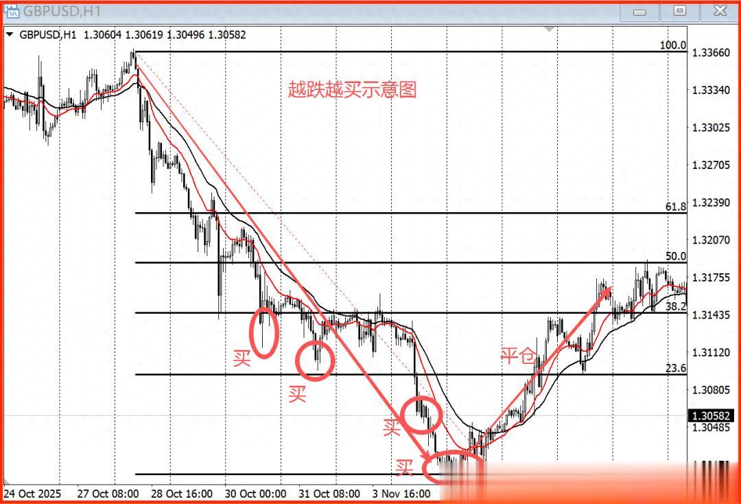 图中是英镑兑美元示意图,行情连续下跌过程中,不断分4次买入,行情回调到黄金分割23.6%的位置,基本就能盈亏持平,再往上38.2%,就能盈利。