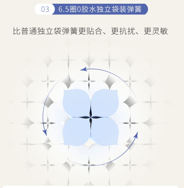 这张床垫用的是6.5圈0胶水独立袋装弹簧,这部分我觉得很值得单独说一下。独立袋装弹簧本身的优点,就是每个弹簧相对独立工作,身体不同部位受力时,能更细致地去承托,不会出现整片一起乱晃的感觉。