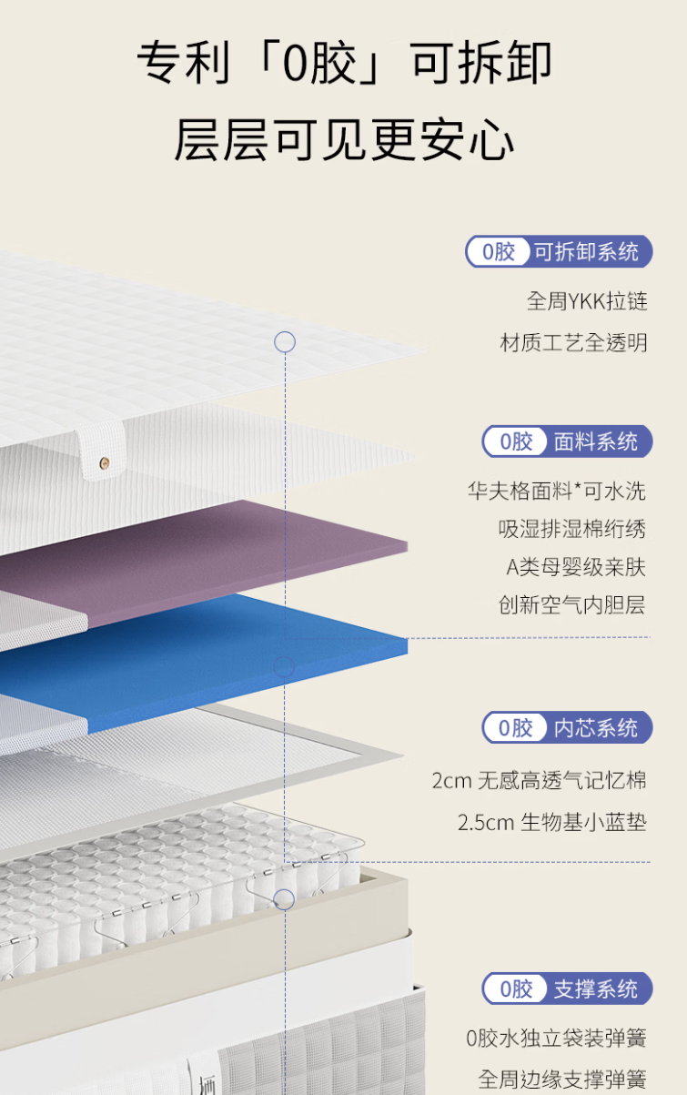 而这张床垫让我最放心的一点,就是它主打的是0胶水设计。很多传统床垫内部层与层之间会用胶去粘合,消费者平时看不到里面结构,也就很难真正知道内部到底用了多少胶。可0胶水床垫的逻辑不一样,它更强调通过结构本身去固定,而不是依赖胶黏工艺去拼接。