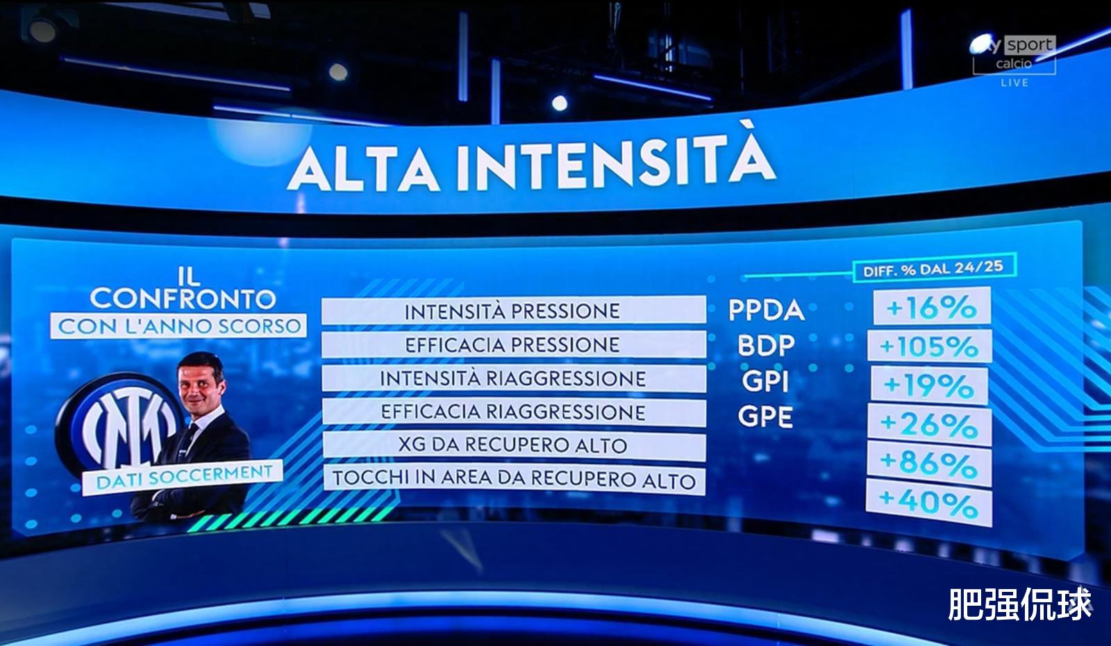 这从数据上就能清晰体现出来,国米向前传球占比、进入对方禁区传球占比和进攻半场斜长传占比三项数据都从上赛季联赛倒数跃升到前5名,而防守半场回传球占比则从第1骤降至14。