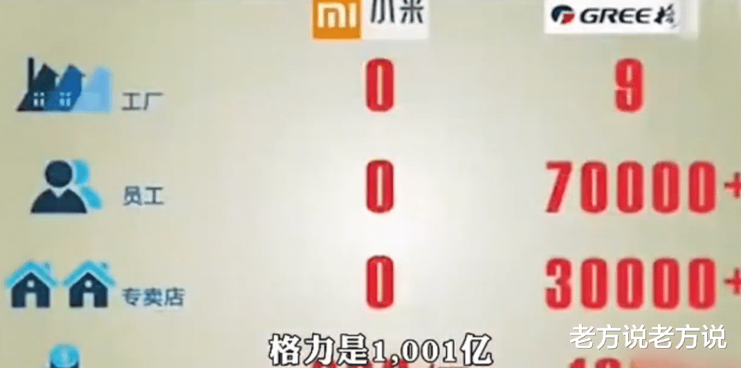 2013年12月12日,在央视财经频道主办的第十四届中国经济年度人物颁奖盛典上,董明珠和雷军都获奖了,现场还有马云和王健林,主持人就放出一张图:如果从工厂的数量来说,小米是0,格力是9。员工数量小米是0,格力是七万以上。专卖店小米是0,格力是三万以上。营业总收入小米是300亿,格力是1007亿。