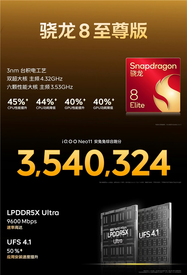 为支撑长时间高负载运行,iQOO Neo11配备了与iQOO 15同款的8K冰穹VC散热系统。大面积液冷均热板充分覆盖主要发热源,高效导出芯片热量,有效抑制机身温度上升。这一设计避免了因过热导致的性能降频,确保性能释放的持续性。从7500mAh大电池与100W闪充的续航组合,到全局直驱供电对电池健康的保护,再到双芯硬件、Monster超核引擎与8K冰穹VC散热的协同运作,iQOO Neo11在性能与续航之间实现了系统级的平衡,为高强度使用场景提供了全方位的保障。