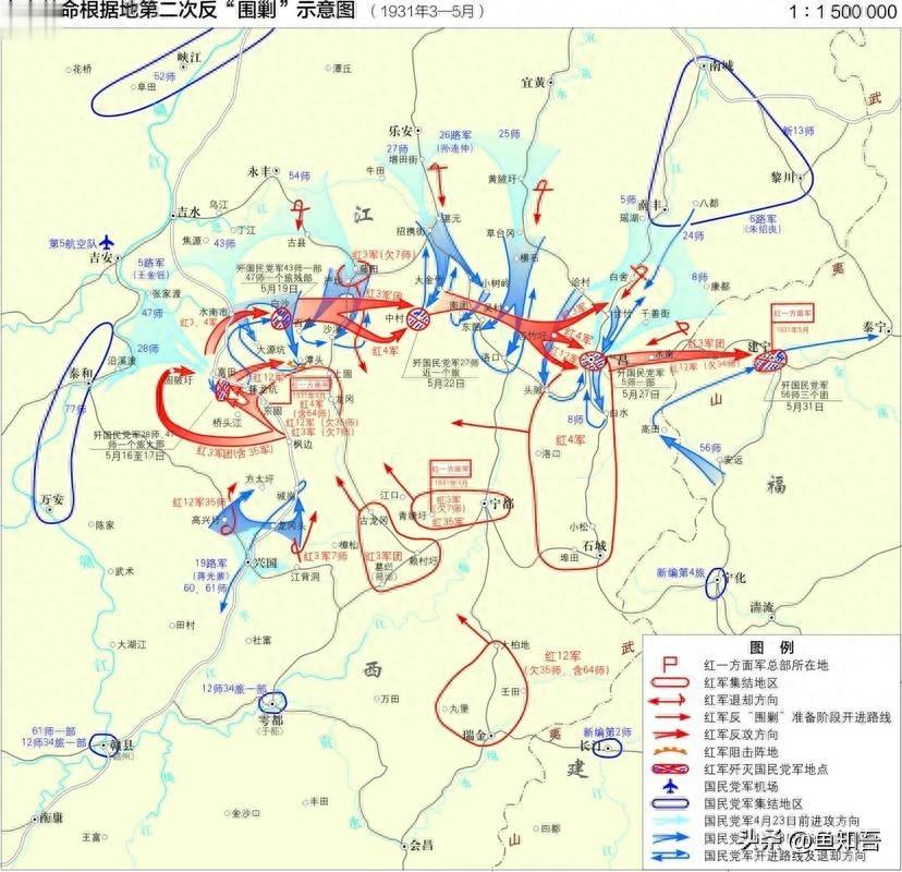 第二次反“围剿”是1931年中央苏区红军以少胜多的经典战役。国民党军何应钦指挥20万兵力,采取“稳扎稳打、步步为营”战术;毛泽东、朱德率3万红军以“诱敌深入”方针应对。自5月16日起,红军15天内自西向东横扫700里,取得富田、白沙、中村、广昌、建宁五战全胜,歼敌3万余人,缴枪2万余支。此战通过集中兵力打击弱敌王金钰部,并以运动战瓦解敌军包围圈,彻底粉碎国民党对中央苏区的第二次“围剿”。