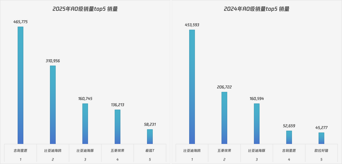 年度销冠的位置还没坐稳,2025年,比亚迪海鸥便以31.1万辆的年销量,惜败冉冉升起的A0级市场新星-吉利星愿,屈居亚军。