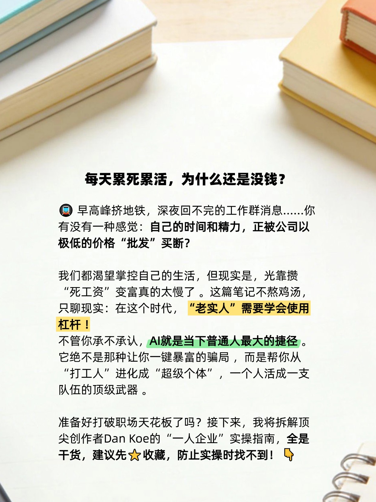 你有没有一种感觉:自己的时间和精力,正被公司以极低的价格“批发”买断? 我们都渴望掌控自己的生活,但现实是,光靠攒“死工资”变富真的太慢了 。这篇笔记不熬鸡汤,只聊现实:在这个时代,“老实人”需要学会使用杠杆 !