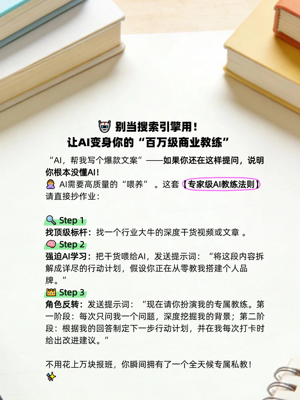 改变很难,但一直穷着更难。选一个你的优势领域,今晚就用第3页的“教练提示词”试一试吧!🔥