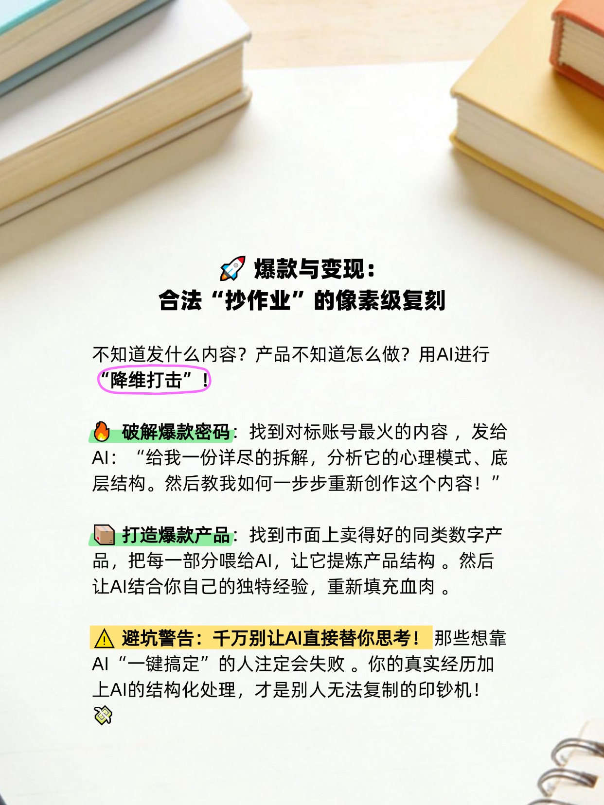 1️⃣ 别做工具人:别天天追着换最新款、最花哨的AI工具 ,核心是用AI优先的思维放大你的能力,建立业务系统 。