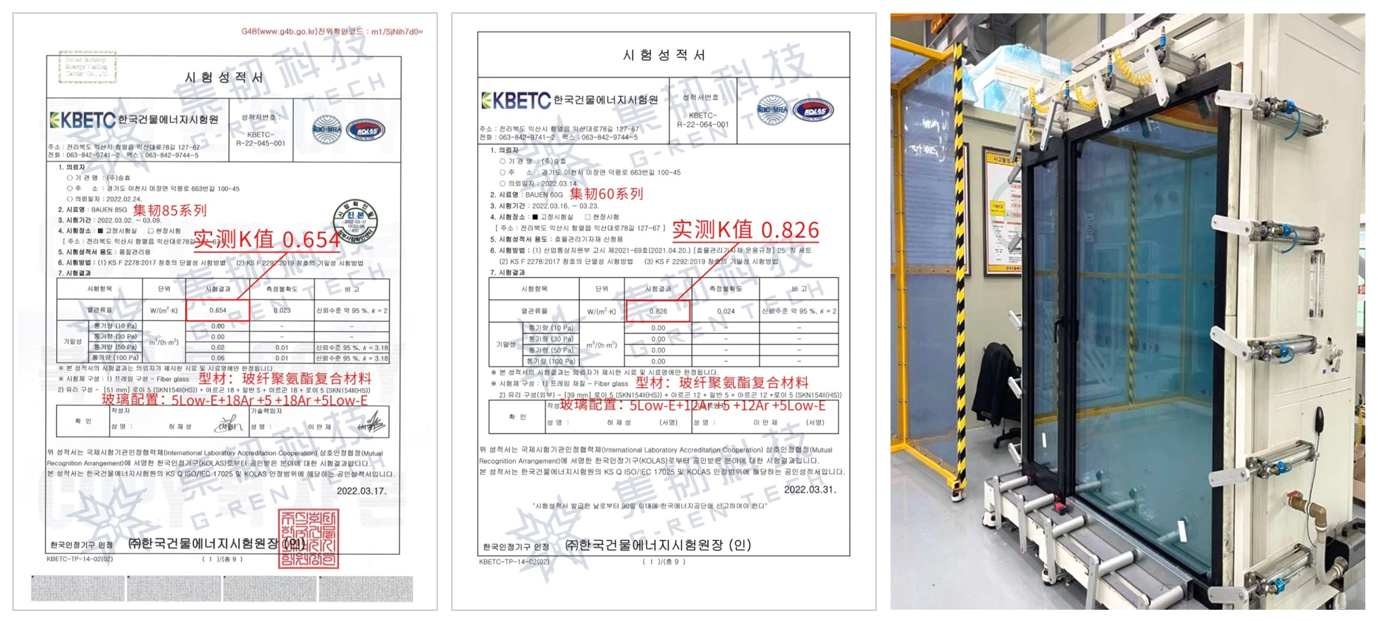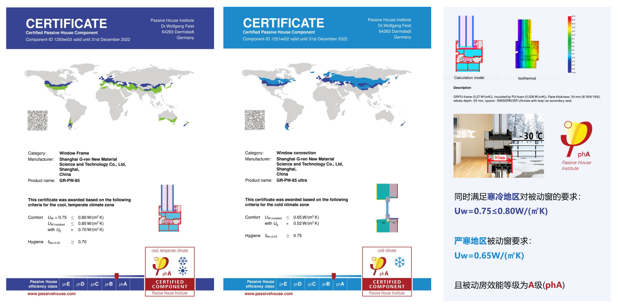 集韧科技GR85系列窗采用“全断桥”结构设计,经韩国权威实验室检测,窗户保温性能K值可达0.654(W/m2·K),可同时满足PHI对于严寒地区和寒冷地区的门窗保温要求,达到phA等级,获得德国被动房机构PHI认证,符合被动式建筑的技术要求,有助于降低建筑运行能耗。