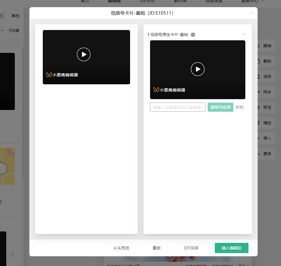 最后,回到小墨鹰编辑器,把复制的链接粘贴到第二步的那个输入框里,点击提取或者确认。这时卡片就应该变成你的视频封面和标题了。整个文章编辑完,预览看看效果没问题,就可以同步到公众号后台发布了。