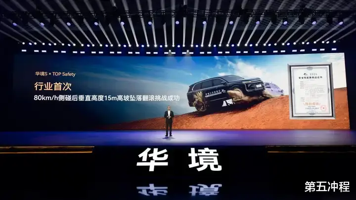 以极致安全为核心基因,华境S参考最新C-NCAP 五星安全标准设计,打造行业领先的全链路防护体系。主动安全层面全系标配华为乾崑全维防碰撞系统CAS 4.0。车身安全层面,华境S携手全球汽车板龙头宝钢,采用核潜艇级2000MPa超高强钢+一体化热成形技术,包括全球首发的一体式热成形前地板骨架和行业领先的一体式热成形双门环,打造五纵十一横底部结构+笼式六环车身框架+四门八处2000MPa防撞梁。此外,华境S携手奥托立夫和延锋,配备同级顶配双腔体远端气囊,以9气囊14腔体实现舱内全维守护,为乘员舱构建坚不可摧的安全屏障。新车更成功通过行业首次“80km/h侧碰后15m高坡坠落翻滚”极限挑战,斩获中汽品科TOP Safety安全性能挑战证书。