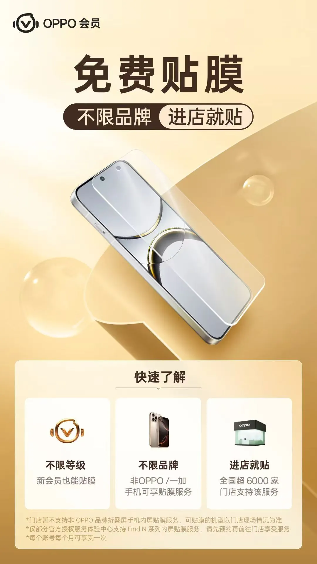 近年,OPPO还为会员提供了每年一次或以上的免费贴膜权益。9月15日,更是将贴膜服务提供覆盖至全品牌。