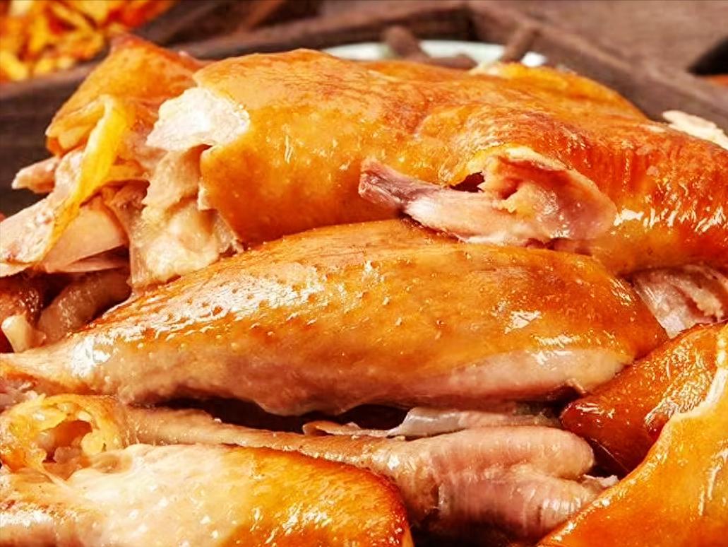做好的金凤扒鸡,色泽金黄诱人,肉质松软香嫩,只需轻轻一撕,骨肉便可轻松分离。