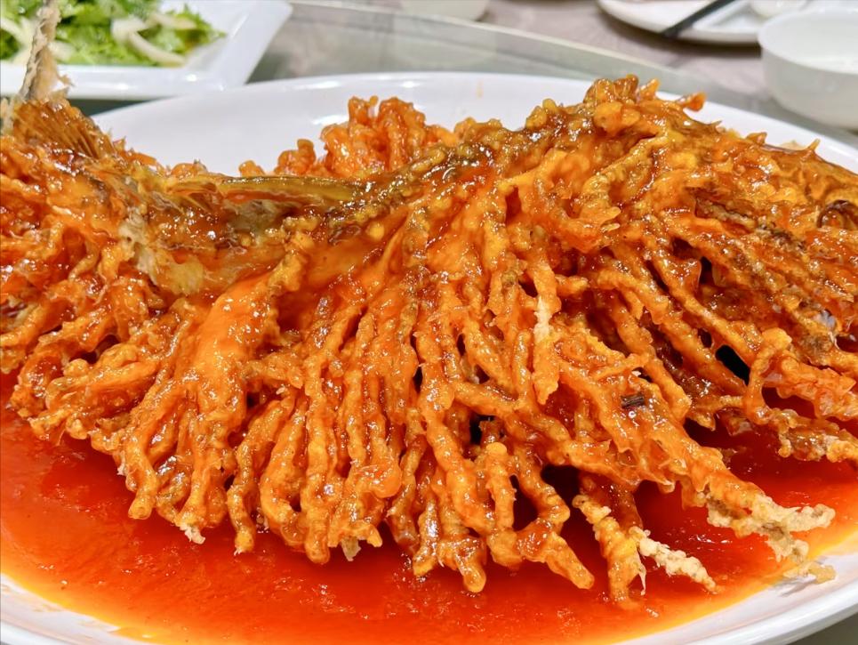 做好的金毛狮子鱼,像一头雄狮,威武霸气,栩栩如生,吃起来外酥里嫩,酸甜开胃。