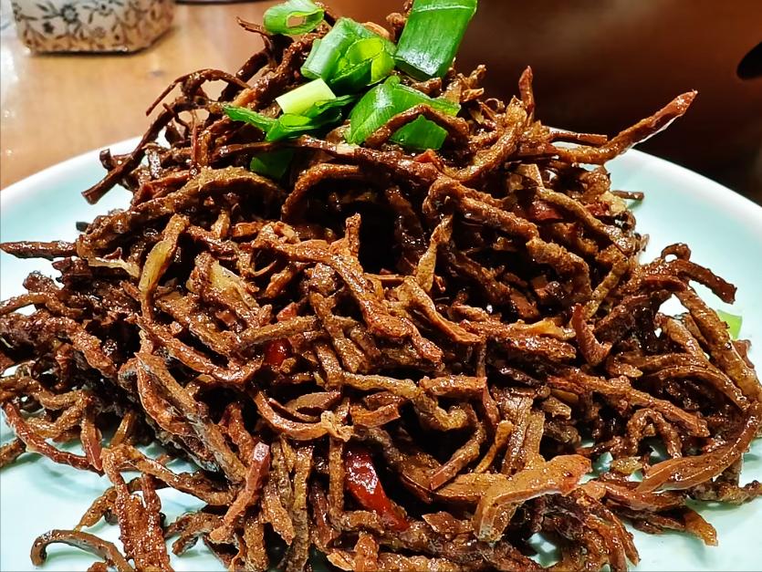 制作崩肝,要选用新鲜的黄牛肝,去掉筋膜,清洗干净,上锅蒸熟,改刀切成细丝,下锅炸至水分水分收干,再起锅烧油,放入葱姜、花椒炒香,放入崩肝,加食盐、生抽、鸡精调味,大火翻炒均匀即可。