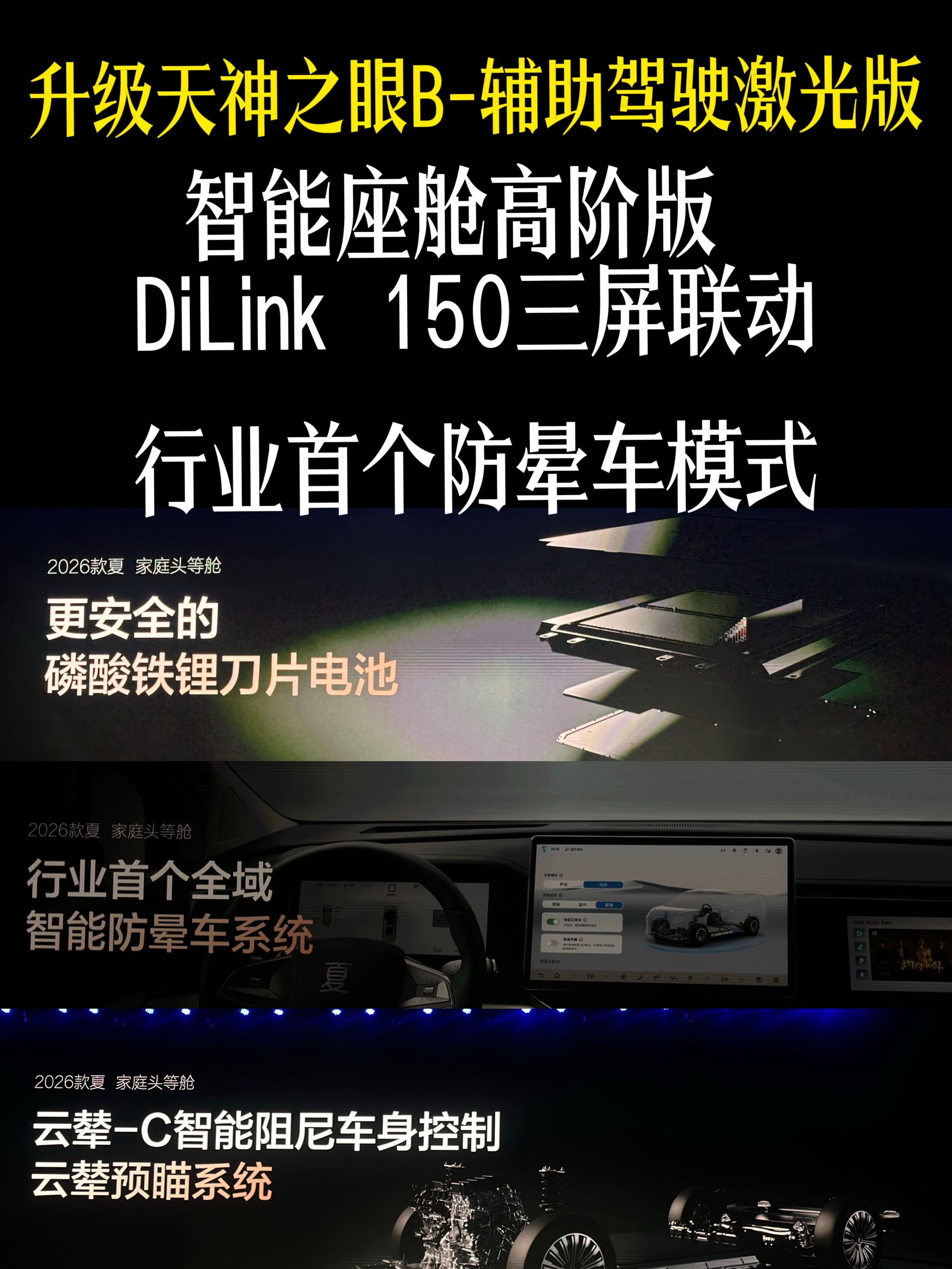 DiLink 150智能座舱,DeepSeek语音大模型、哨兵模式、无麦K歌,支持多品牌手机互联;还可以选装12.3英寸副驾娱乐屏和PM2.5过滤装置。