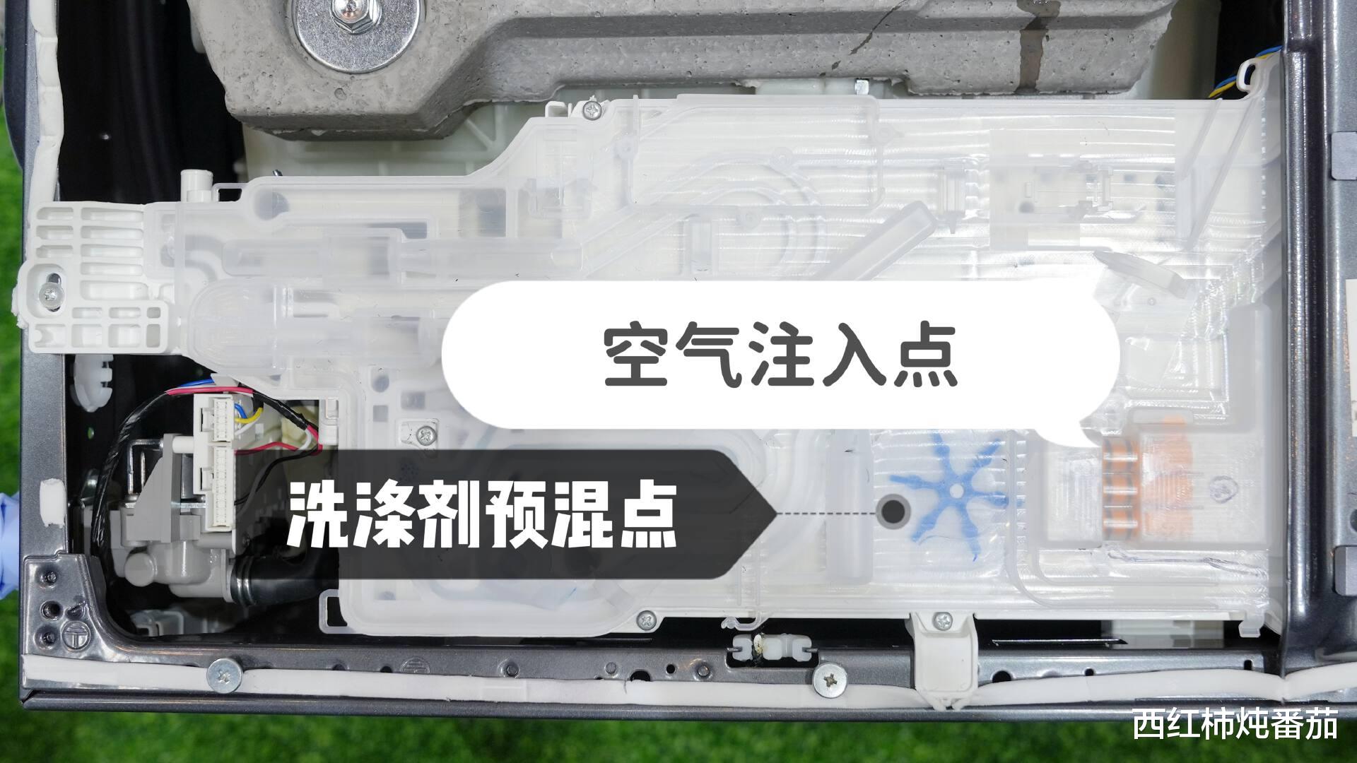 所谓精华洗,就是让洗涤剂在投放阶段就和清水进行预混并注入空气,提前激活洗涤剂活性(提前溶解&起泡),然后均匀喷洒到衣物表面,让洗涤剂更加高效地渗入衣物纤维,从而更好的溶解污渍 ▲
