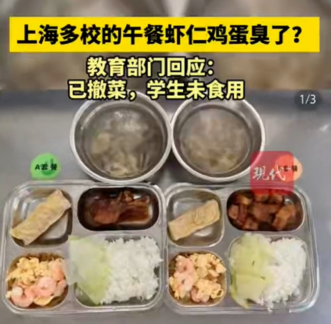 9月15日,有学生家长反映,当天中午的学生餐里,一道虾仁炒蛋被临时撤掉,学生说这道菜“有臭味”,“吃到呕吐”,学校补发了饼干、面包作为替代。该套餐由上海绿捷实业发展有限公司提供。