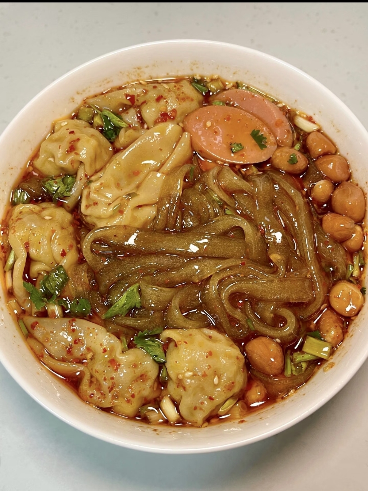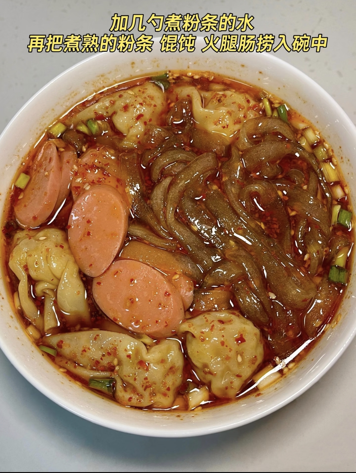 当红油的辣、香醋的酸、蚝油的鲜与红薯宽粉独特的软糯在舌尖上完美融合,那种层次分明的口感瞬间唤醒沉睡的味蕾。小馄饨皮薄馅大,吸饱了酸辣汤汁,每一口都是惊喜。红薯宽粉则像一条条滑溜的小鱼,在唇齿间穿梭,带来“糯叽叽”的快乐。若是再加上几片火腿肠,更添一份咸香,让整碗美食的风味更加丰富。
