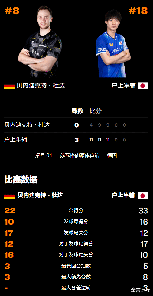 北京时间11月5日凌晨,乒乓球WTT德国法兰克福冠军赛结束首日的最后一场男单首轮对决,日本世界冠军户上隼辅以绝对优势3-0淘汰世界排名第8的德国主力杜达晋级16强,后者也由此而成为达科(世界排名第9,首轮0-3不敌美国选手卡纳克)之后第二位被淘汰的世界前十选手——目前本站比赛已有7人晋级男单16强,户上隼辅VS杜达战况与其他场次详情请看下文。