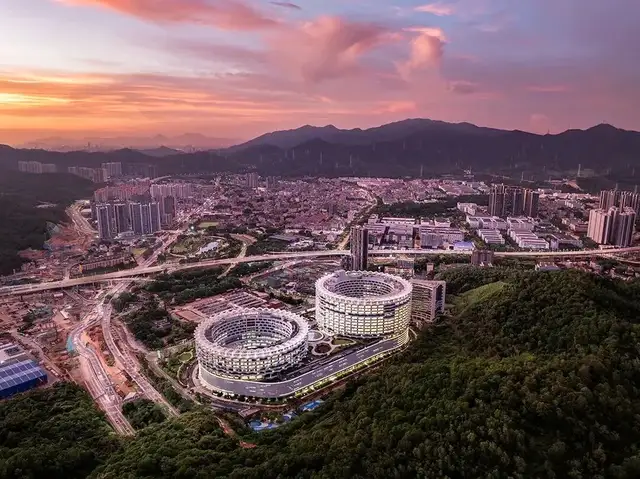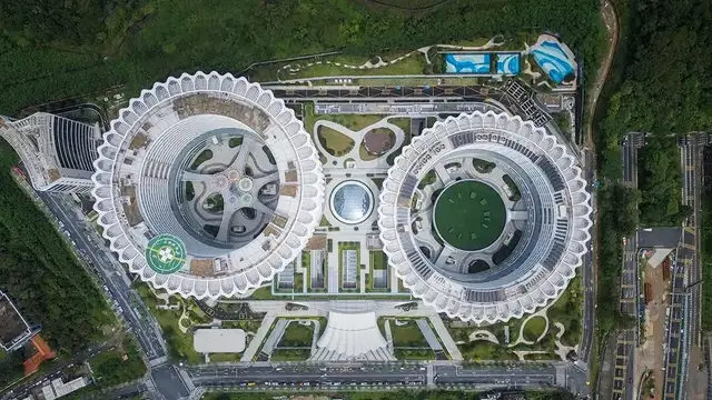 两栋圆形塔楼一高一低,悬浮于裙房基座之上,形成一个完整的有机体。形似客家围屋的主楼,反映大鹏深厚的客家文化。