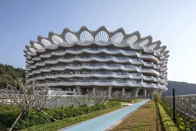 大鹏医院颠覆了人们对于传统医院的固有印象,灵感汲取自大鹏半岛的山海风光,以”生命之环“为意象。选址群山环抱且可远眺大海,采用依山就势的低层布局,既保障通风顺畅,更实现建筑与自然的和谐共生。