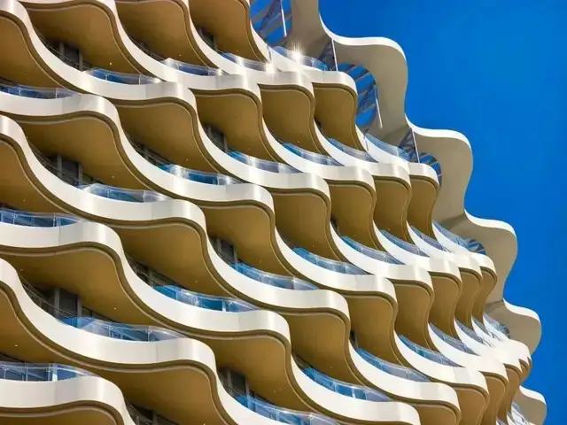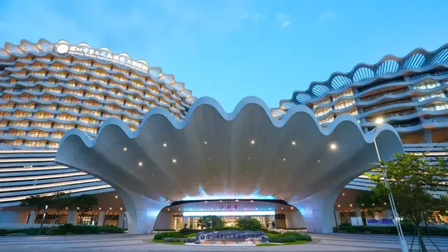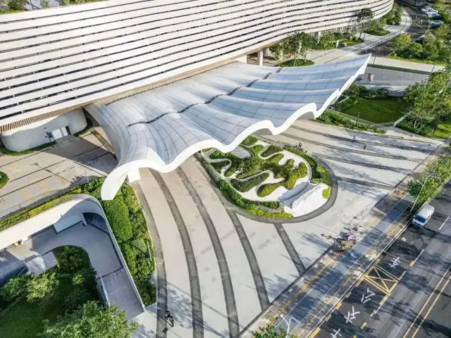 从远处看,塔楼外延伸出波浪般的水平阳台,层层旋转如海浪起伏;主入口处,尺度恢弘的雨棚恣意延伸而出,悬挑达25米,仿佛刚刚从海面上升起的贝壳,充满灵动气息。