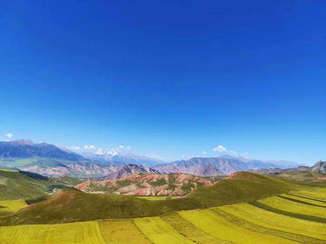 当金黄的油菜花、红色山的体砾石、绿色的山体草地互相映衬,这里就汇聚成上帝的调色板。