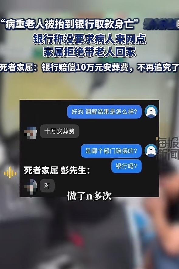 银行负责老人的丧葬事宜,并且以慰问金的形式向家属支付 10 万元。这个结局也算给了双方一个交代,没有让矛盾进一步激化,像一场风暴过后,终于慢慢恢复了平静。