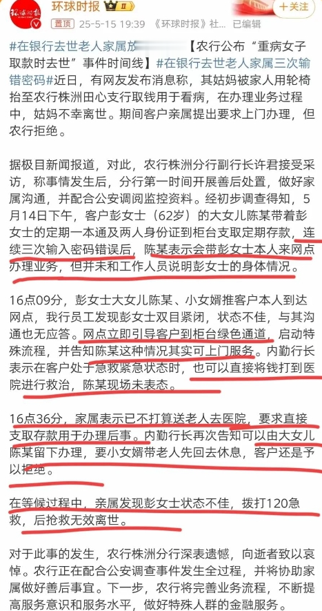 事情得从老人委托子女取钱说起。那天,子女带着 5 万元存折来到湖南农业银行取款。可世事难料,连续 3 次密码输入错误后,账户被锁住了。按规定,若要继续取款,必须本人到场。子女们没向工作人员透露老人病危不方便的情况,就把坐在轮椅上的老人推到了银行。