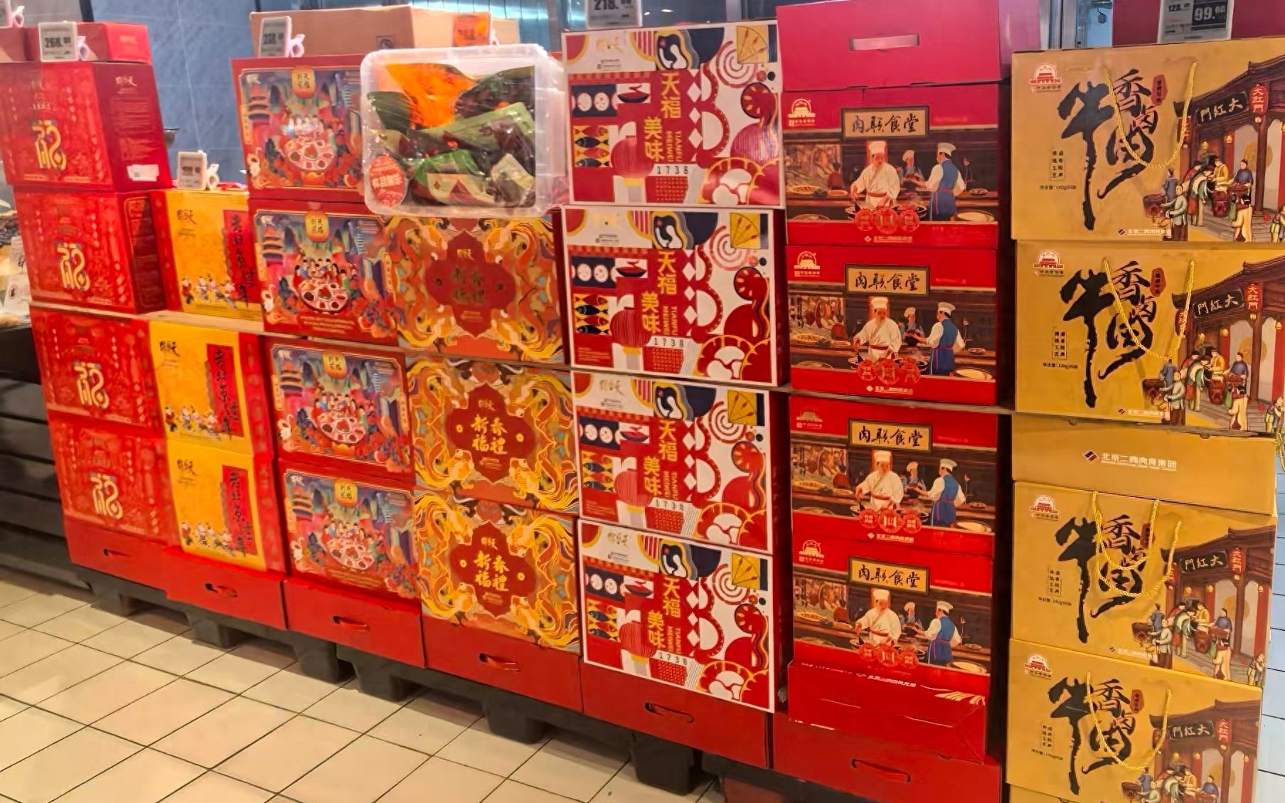 超市里的肉品年货礼盒堆头。 新京报记者 王思炀 摄