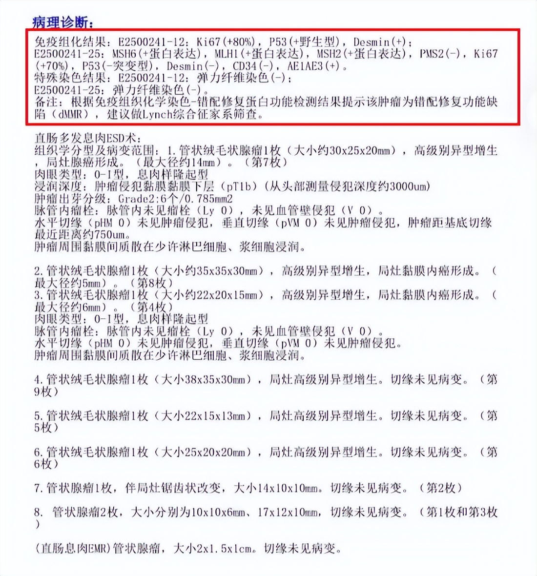 先看之前的这张报告,患者被诊断为全结肠中分化腺癌,伴有高级别上皮内瘤变及局灶癌变。肿瘤浸润至黏膜肌层,但未见脉管内癌栓及神经侵犯,这算是为数不多的好消息。
