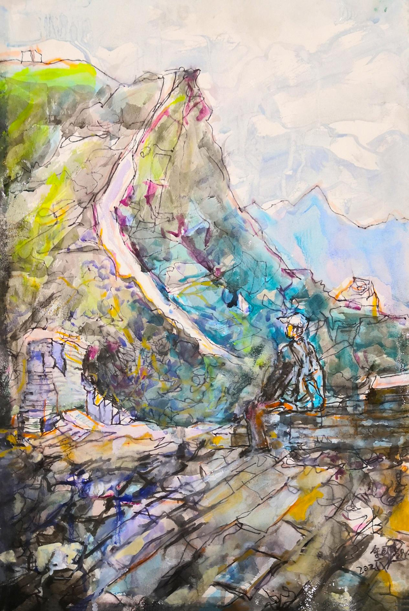 线条在余先生的画作中,犹如灵动的舞者,自由而奔放。它们蜿蜒曲折,似长城在山峦间起伏;它们刚劲有力,如长城的脊梁,坚毅而挺拔。这些线条,或疏或密,或虚或实,营造出一种独特的节奏感和韵律美,仿佛将我们带入了长城那悠远的历史长河之中。
