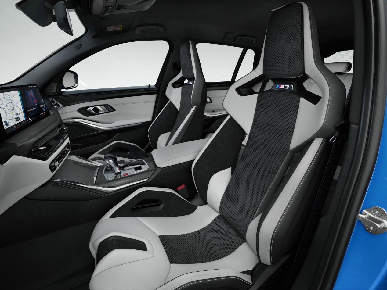 细节处的性能基因同样清晰可见。覆盖车身的碳纤维组件,包括:多边形进气口、后视镜罩、尾部扩散器,以及车顶扰流板,在强化运动姿态的同时,也让空气流动更高效—轻量化与美感在此达成平衡。座舱内,M碳纤维座椅让轻量和舒适兼得,为长途驾驶保留惬意体验。