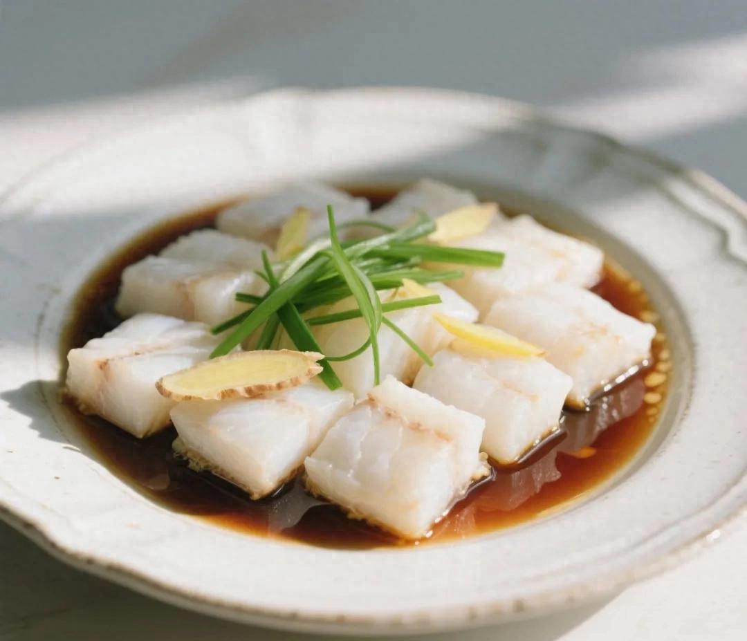 鳕鱼块洗净,用厨房纸吸干水分,铺在铺有姜片的盘中;淋少许料酒去腥,撒少量盐和白胡椒粉腌制10分钟;水开后上锅蒸8-10分钟,出锅淋一勺蒸鱼豉油,撒葱花、浇一勺热油即可。