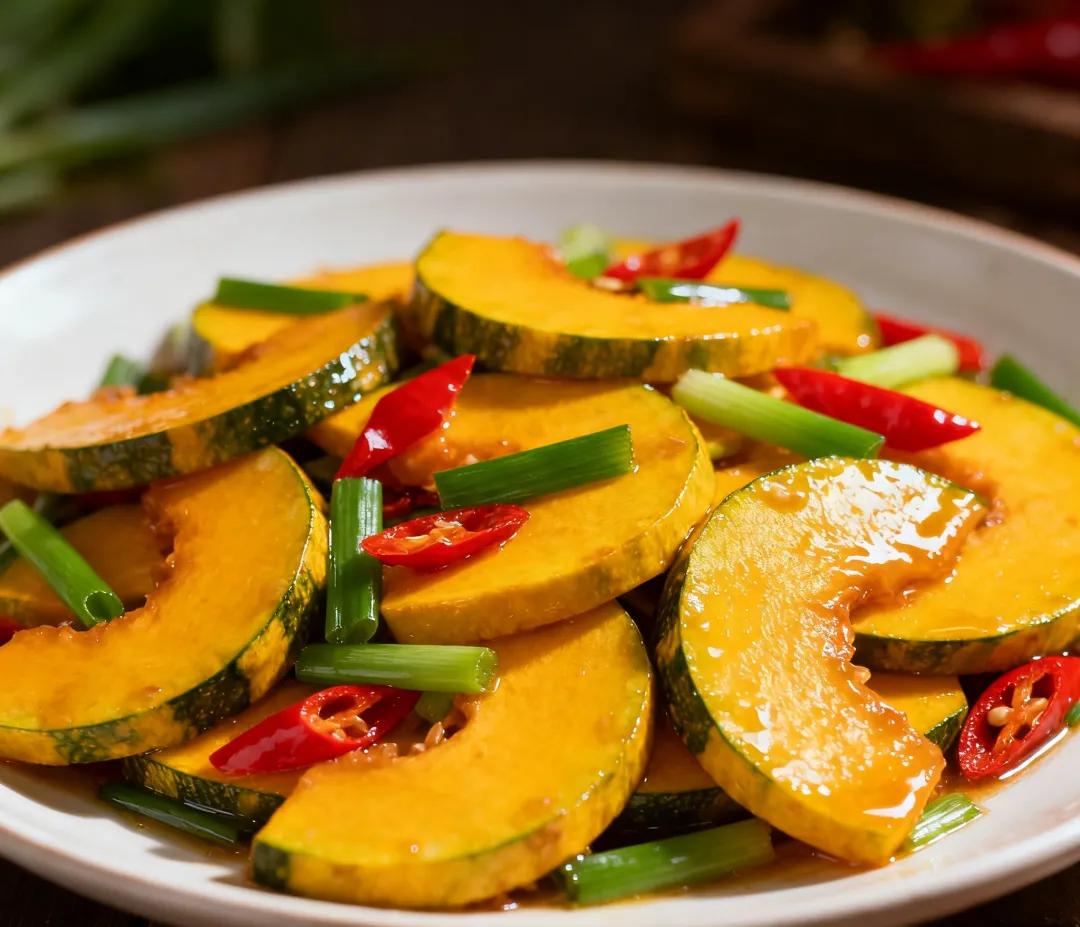 南瓜去皮去籽,切成薄片;锅中放少许橄榄油,下蒜末爆香,倒入南瓜片,辣椒,翻炒均匀;加少量清水焖煮3分钟,至南瓜变软,加盐和少许生抽调味即可。