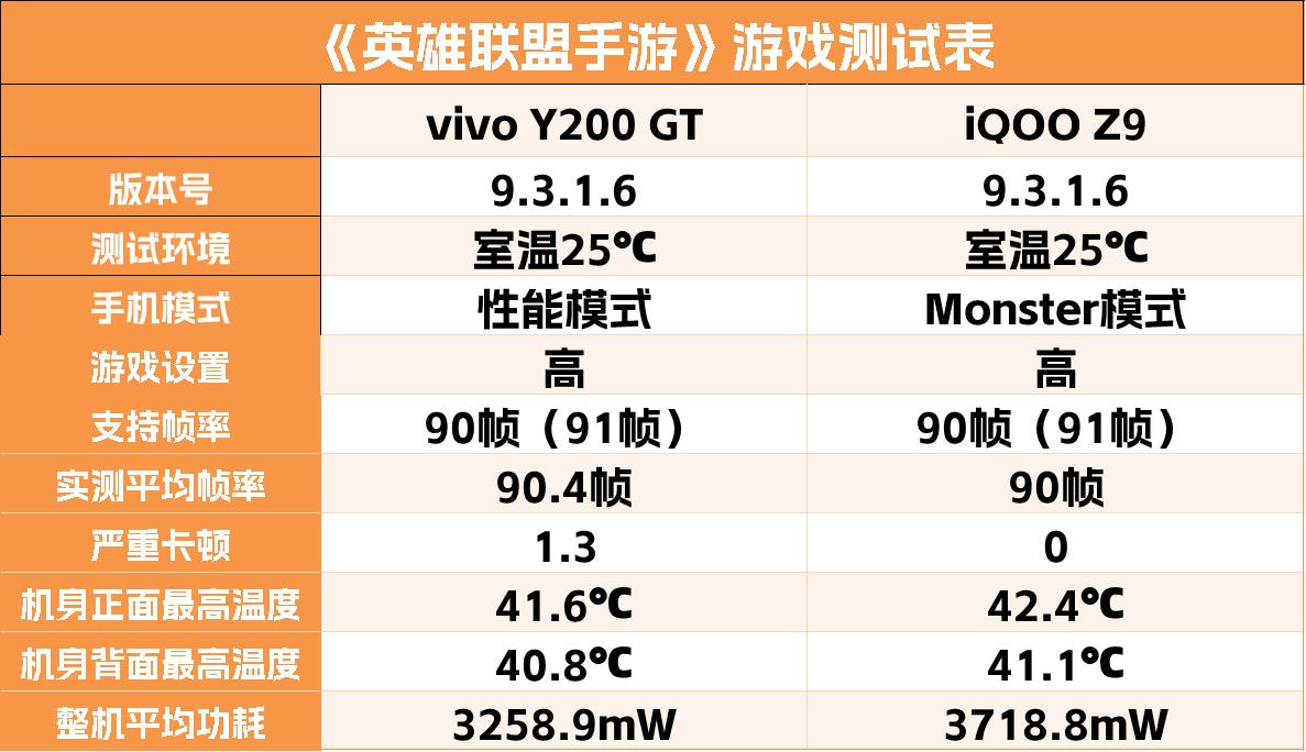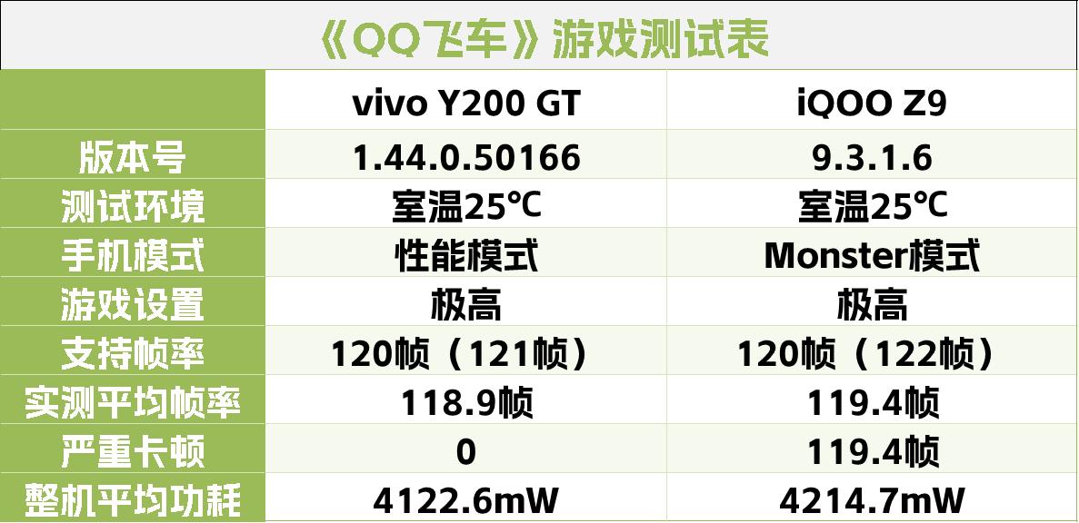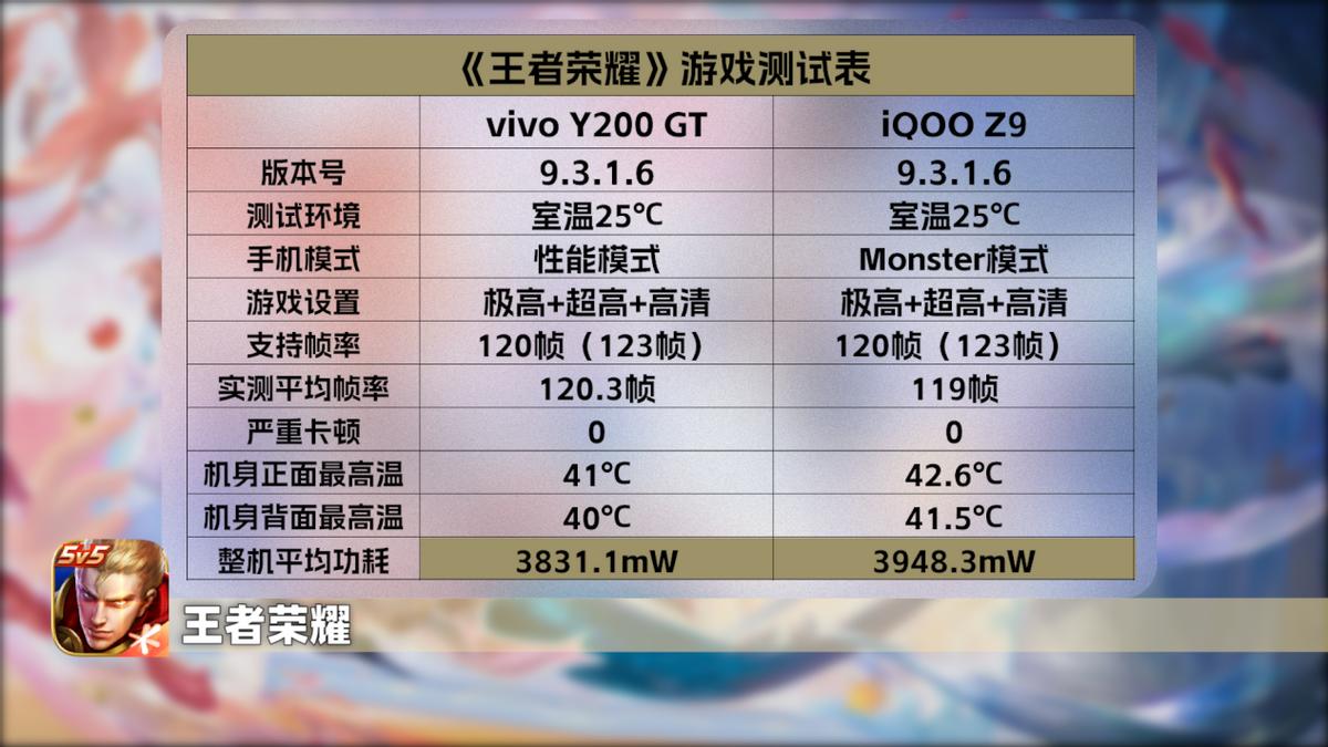 《王者荣耀》在极高+高清设置下可以支持120帧,还有额外3帧的小加成,平均帧率是120.3帧,机身最高温度是41℃,功耗是3.8W,跟iQOO Z9很接近。