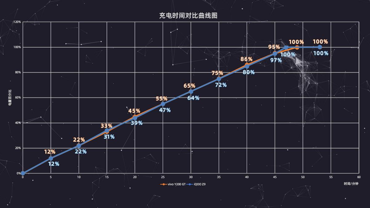 在充电时间上,5分钟充电12%,10分钟充电22%,20分钟充电45%,半小时充到了65%,在第49分钟UI显示充满,这个时候线上功率还有12.7W,4分钟后断充,总耗时53分钟,跟我们前面测试的 iQOO Z9一致。