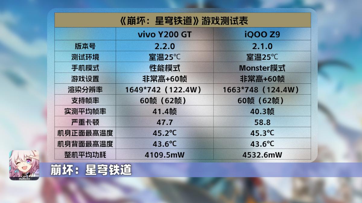 再来看压力更大的《崩坏:星穹铁道》,渲染分辨率接近于720P,平均帧率是41.4帧,帧率波动同样很大,机身最高温度是45.2℃。vivo Y200 GT的帧率比iQOO Z9略高一些,机身最高温度非常接近,但是功耗更低一点。