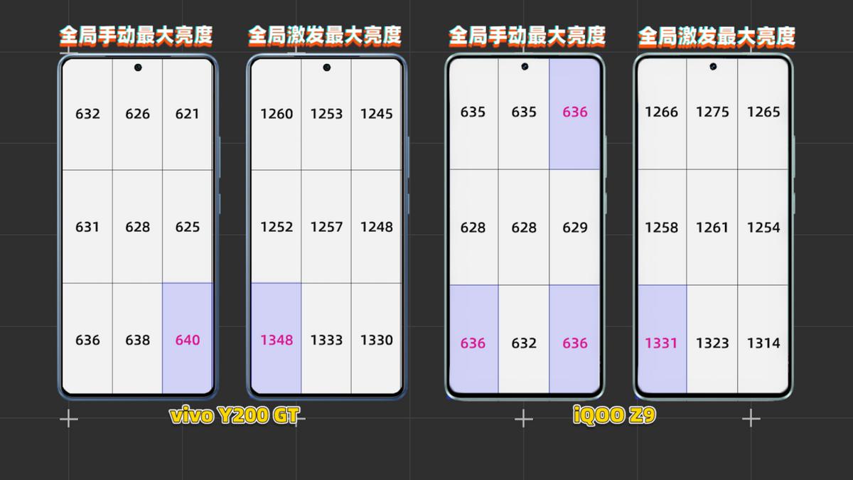 就我们的实测,手动最大亮度是640nit,激发最大亮度是1348nit,跟iQOO Z9非常接近。