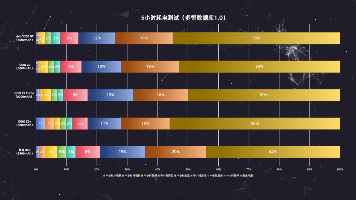 在5小时续航模型中,耗电量是45%,最终剩余55%的电量,略好于iQOO Z9和Z9 Turbo。有了6000mAh大电池加持,vivo Y200 GT的续航成绩确实非常出色。